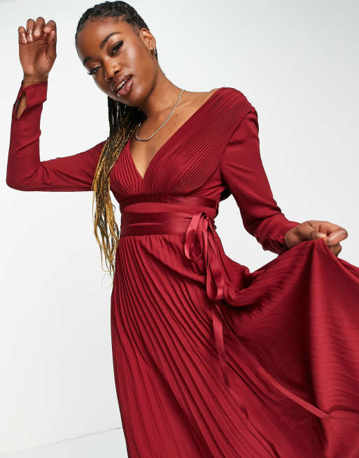 Vestido de dama de honor largo burdeos de manga larga con dise o plisado y cintura cruzada de sat n de ASOS DESIGN Very well made.