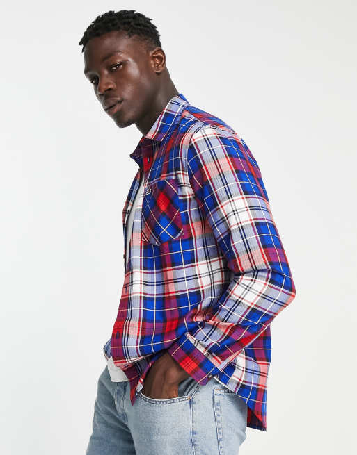 Camisa azul multicolor a cuadros con parche del logo de franela de Very well made.