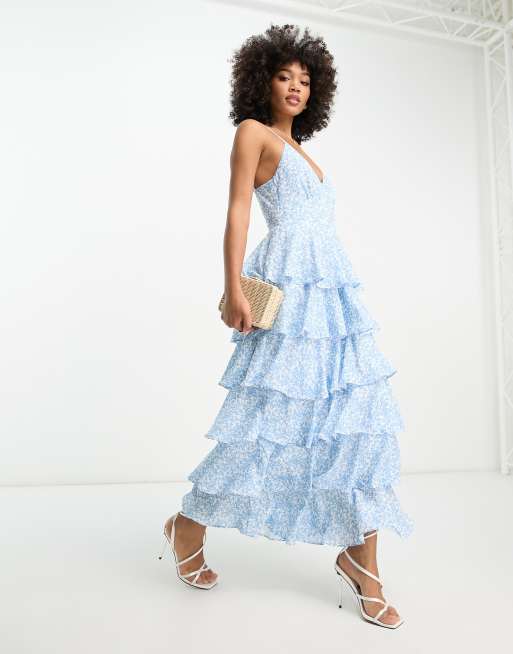 Pretty Lavish Gelaagde maxi jurk met ruches in blauwe fijne bloemenprint Very well made.