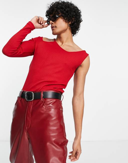 ASOS DESIGN T shirt ajust manches longues avec d coupes et une seule manche Rouge et rose Very well made.