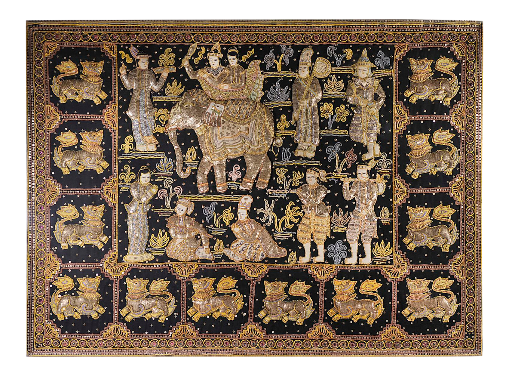 Rare Antique Vintage Burmese Kalaga Tapestry Wall Hanging 42X17 Textile elephant Very well made.