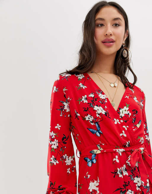 Parisian Tall long sleeve tie waist playsuit in red floral print Very well made.